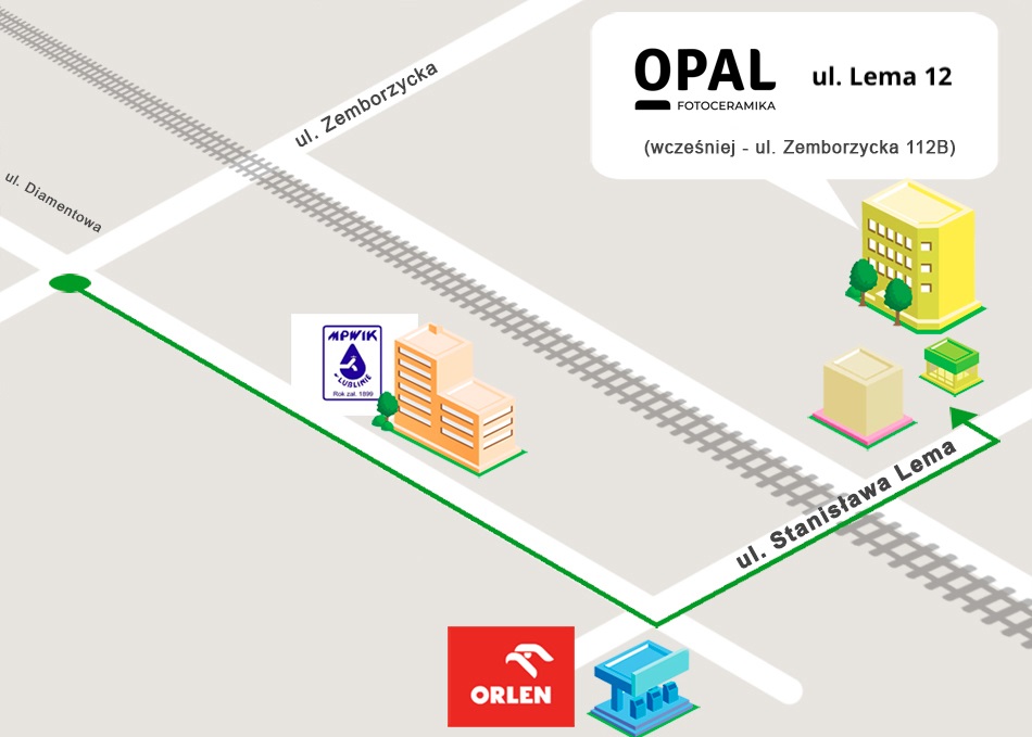 From Zemborzycka Street, at the crossing with Diamentowa Street, turn towards the Orlen station. At the height of the station, turn left into Lema Street. Cross the tracks and after approx. 150 m Opal Fotoceramika will be on the left side.